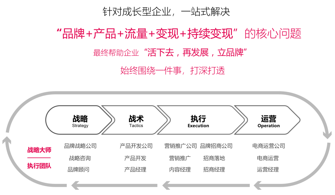 美御以結(jié)果為導(dǎo)向,以年輕化戰(zhàn)略和創(chuàng)新思維為手段,通過創(chuàng)新的戰(zhàn)略打法,從戰(zhàn)略到戰(zhàn)術(shù)、從執(zhí)行到運(yùn)營,為成長型企業(yè)量身定制,通過貼身服務(wù)、深度綁定,一站式解決“品牌+產(chǎn)品+流量+變現(xiàn)+持續(xù)變現(xiàn)”的核心問題,幫助企業(yè)“活下去、再發(fā)展、立品牌”!